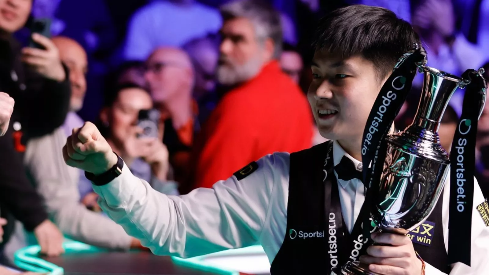 Zhao Xintong was in a celebratory mood after thumping Judd Trump 10-3 to lift the 2026 Tour Championship crown in Manchester on Sunday.